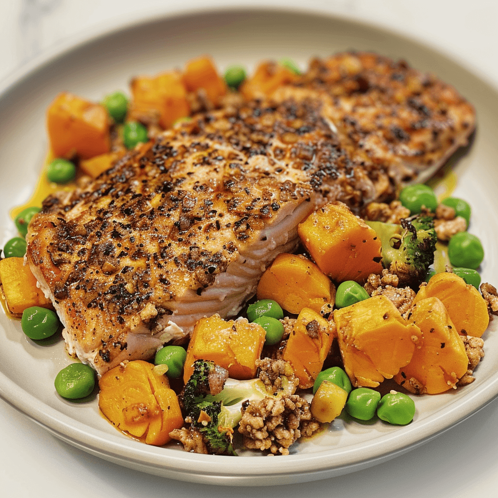 Add the Vegetables: Add the diced carrots, peas, spinach, and cooked sweet potatoes to the turkey and salmon mixture. Stir everything until well combined.